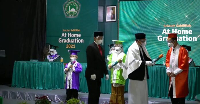 Sesuai tema kegiatan “Sekolah Sabilillah At Home Graduation”, terlihat hanya beberapa peserta yang hadir secara luring. Sedangkan mayoritas siswa mengikuti gelaran wisuda secara daring via zoom.