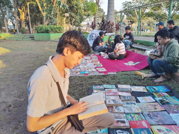 Malang, IP – Minggu (5/11/2023) kala itu, susunan rapi buku-buku di Taman Merjosari Kota Malang menemani waktu sore gerombolan anak kecil dan anak muda. Sejak pukul 15.30 WIB, mereka terlihat sedang fokus pada lembaran-lembaran yang dipegangnya.